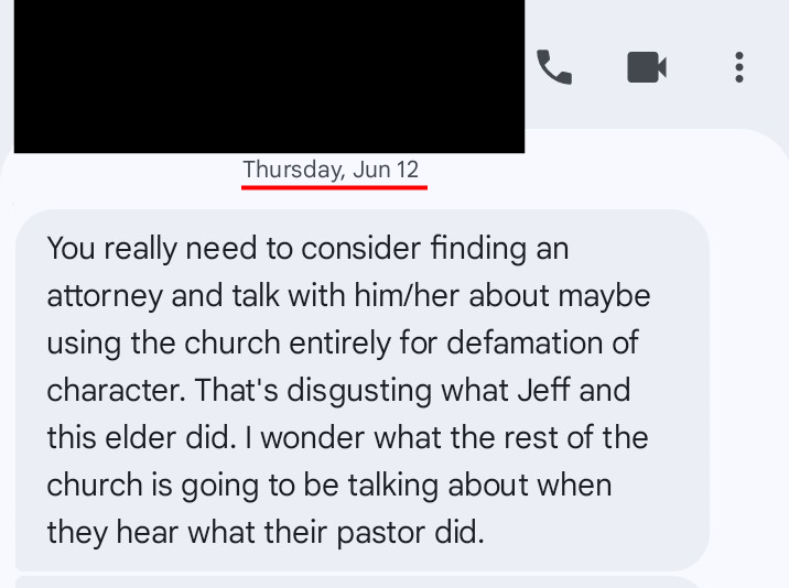 Image #4: Confidential individual who finds Jeff Kaplan and Shepherd of the Hills’ Elder board actions “disgusting”. Screenshot taken June 12th, 2025.