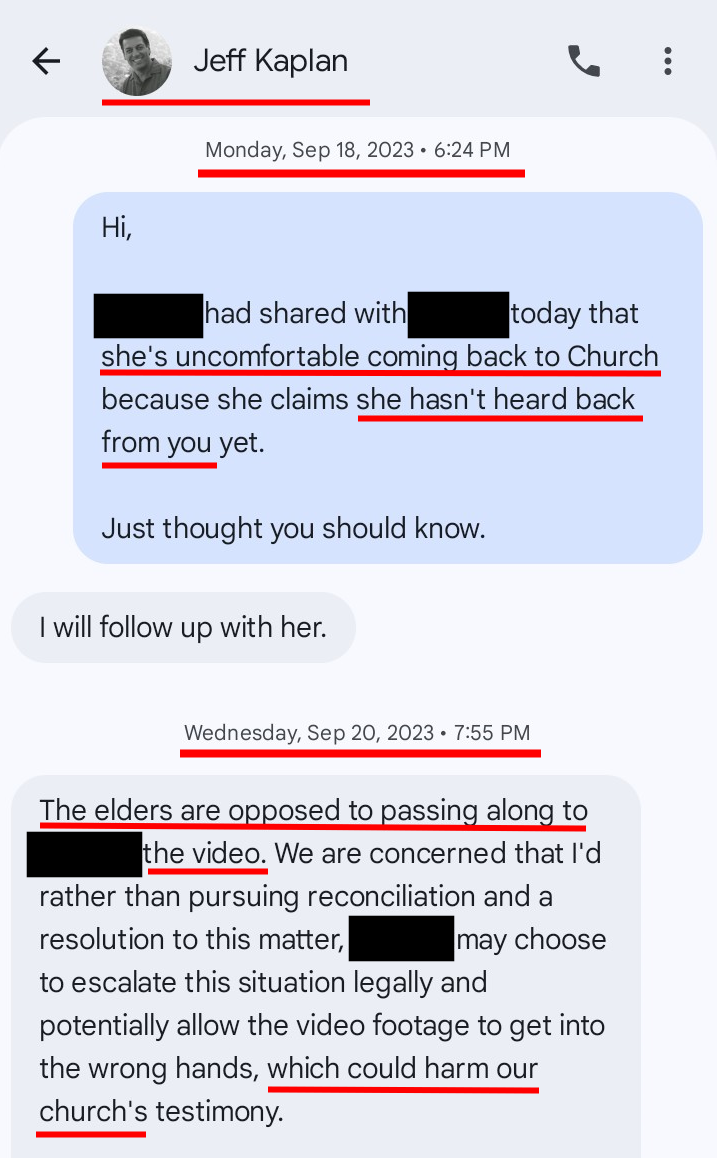 Image #3. Text message from Jeff Kaplan refusing to provide the sexual assault victim a copy of the video in an effort to protect Shepherd of the Hills’ “church testimony”.