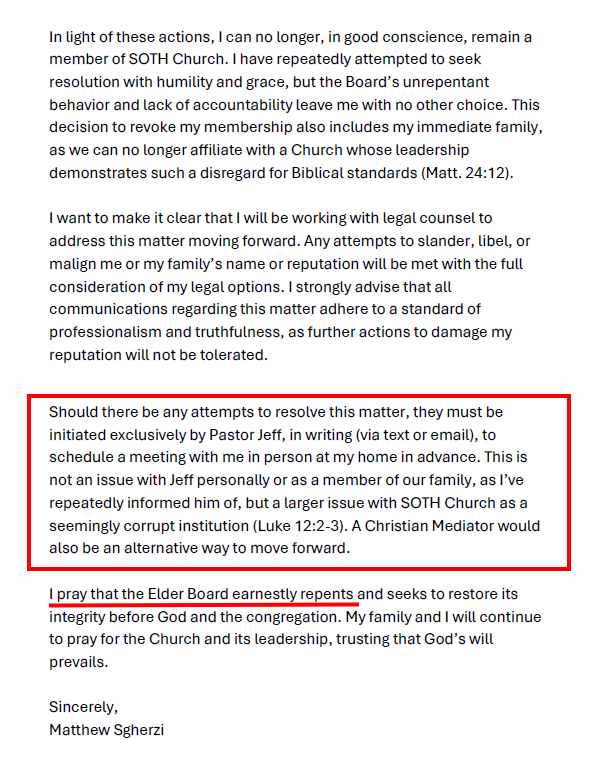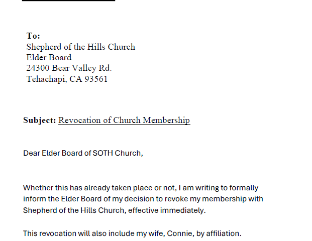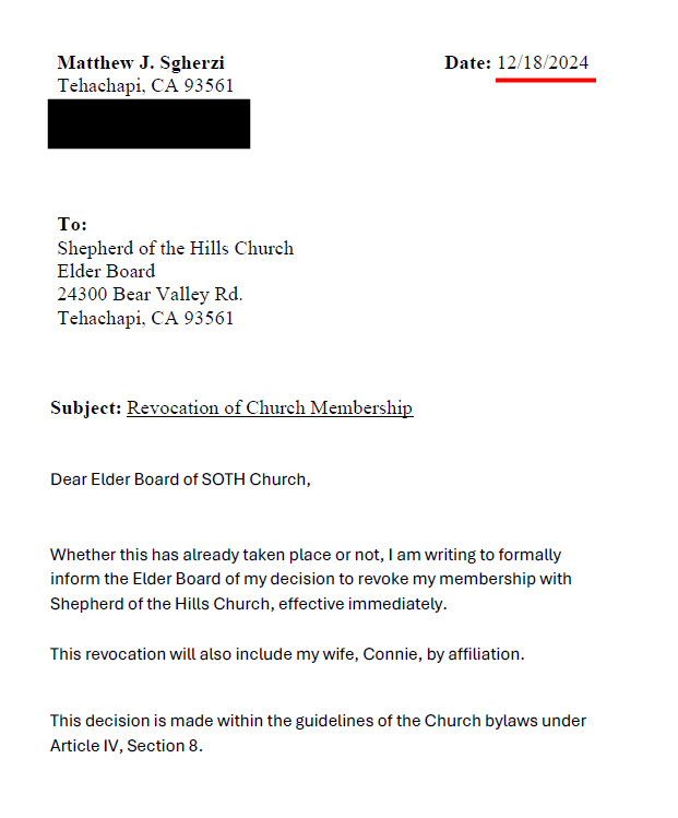 Attached to this post is my family’s official resignation of our Church Membership from Shepherd of the Hills Church. Dated December 18th, 2024.