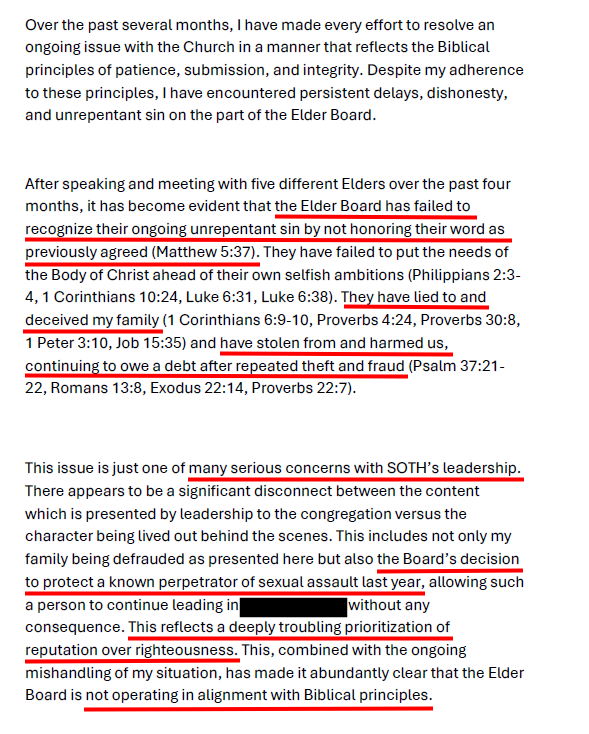 I informed the Elder Board that we could no longer associate with a Church who would mishandle a sexual assault, intentionally steal money from our family by refusing to reimburse thousands of dollars in unpaid Shepherd of the Hills expenses, all in retaliation, in my opinion, simply because our family was being led by God to a different Church due to our growing family.